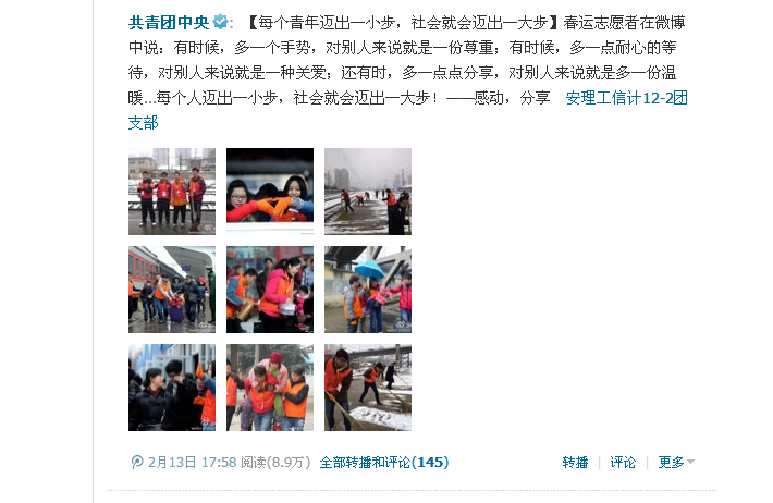 在为期1个月的志愿服务活动中,广大志愿者充分发挥生力军和突击队作用,将热心化为对旅客的细致周到服务,用热情烘烤着归乡人的丝丝寒意,拿行动给旅客们送去了便利和帮助,让旅客们感受到了“虽是他乡之客,却似身在家中”的温暖。在短短不到1个月的时间里,安徽理工大学这些年轻的志愿者们共服务了7000余小时,帮扶重点旅客2000余人,成为春运大潮中那最绚丽的“一抹红”。人民网、共青团中央微博,淮河早报都在第一时间对我校的春运志愿者服务工作进行了报道和转载。