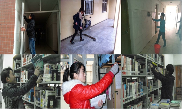 后勤宿管中心勤工助学活动主要有两项:宿舍楼内楼道和墙壁的卫生保洁,配合楼管阿姨做好学生晚间宿舍考勤并记录。图书馆勤工助学活动主要是将师生归还的图书分类上架和阅览室的卫生保洁。虽然都是日常而平凡的工作,但也需要耐心和毅力,需要仔细与认真,更需要热爱平凡重复劳动的真心,才能确保工作的圆满顺利完成。
