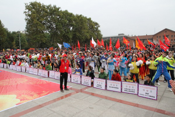 我校啦啦操队喜获大学乙组集体花球自选动作第一名和大学乙组技巧三级规定动作第一名;由我校外国语学院教职工组成的青春飞扬艺术团喜获广场操(35岁)现代(综合)徒手第一名;由我校教职工组成的健康快乐艺术团喜获广场操(50岁)现代(综合)徒手第一名的好成绩。