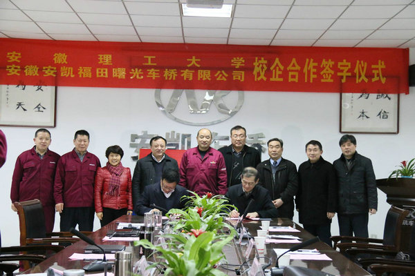 1月15日下午,安徽理工大学与安徽安凯福田曙光车桥有限公司的校企合作协议签字仪式和产学研基地、教学实习基地揭牌仪式在合肥举行。副校长王其东、安徽安凯福田曙光车桥有限公司总经理陈强参加签字仪式。