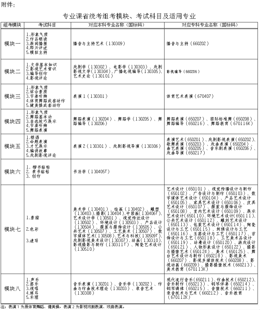 2.专业课全省统一考试(以下简称省统考)报名。按照教育部颁布的艺术基础科类与本科专业对应表,各专业省统考根据其考试科目(相同或相近)共设置8个组考模块(各模块对应的专业详见附件),艺术类考生必须选择1个与所报专业相对应的统考模块参加专业课省统考。艺术类考生在文化课高考报名的同时,还须完成专业课网上报名手续。考生可以兼报不同模块的考试。