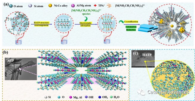 该工作通过一锅水热法制备了凹凸棒石基MFI沸石封装Ni-Co合金结构,系统研究了物理限域耦合合金效应如何稳定催化剂活性位点的同时而不牺牲其活性,从而提高DRM性能。富缺陷Ni-Co合金可通过Ni表面电子富集增强甲烷C-H裂解能力,其缺陷位点与ADM沸石封装层表面碱性位点可协同促进CO2分子吸附活化及时移除C*积炭前驱体。另外,ADM沸石可提供物理封装作用抑制合金结构的迁移、合并、生长,从而实现高效、稳定催化转化甲烷-二氧化碳制备合成气。
