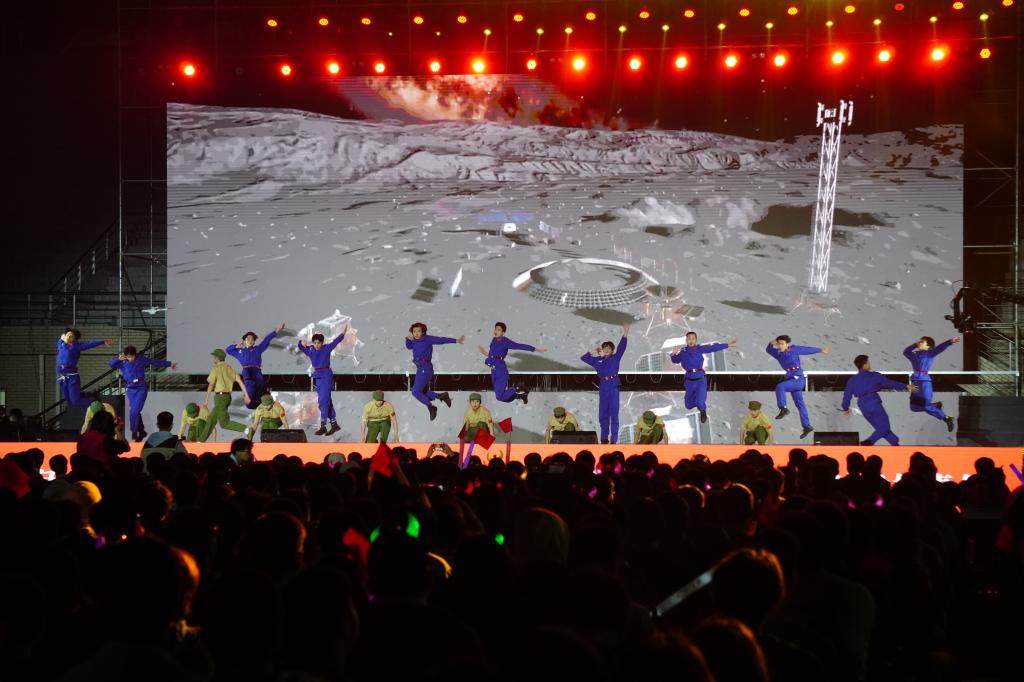 晚会聚焦党的十八大以来我国经济社会发展所取得的各项突出成就,围绕经济、政治、文化、社会和生态文明建设“五位一体”总体布局,以歌曲、舞蹈、器乐、情景剧等形式展现出一台精彩绝伦的艺术盛会与思政课堂。歌舞《时代感》开场燃动现场,青春的舞姿伴随着动感的旋律唱出了新时代新风范,舞出了新时代你我他;现代舞《星火永相传》以时空交错的表现形式将一代代航天科技工作者立志科技报国的感人故事搬上舞台,表达安理学子奋斗朝夕逐梦行、矢志投身国家重大工程的精神;歌舞情景表演《达拉崩吧(安理版)》是为2022级新同学量身定制的节目,歌手全新改编了歌词向全体新同学们“种草”校园里的美食美景和生活学习的经验,引起现场同学的强烈共鸣;2022级新生辅导员与新生合唱的歌曲《孤勇者》则掀起了全场热潮,新同学们勇敢表达青春的无畏与担当,现场万名同学齐声合唱,呼唤出开启大学征程的全新梦想;故事讲述《燃烧的雪花》由我校土木建筑学院宋恩周同学以北京冬奥会志愿者的身份分享了冬奥志愿者的点滴故事,诉说新时代中国青年胸怀天下的勇毅与决心、服务社会的奉献与担当;器乐演奏《山川和韵》以春夏秋冬四个季节为序,融合包含古人智慧的文化精髓“二十四节气”为切入,演奏出人与自然和谐共生的生态之美,大美中国青山绿水的锦绣画卷。“伟大的中国共产党,乘风破浪,扬帆远航,领航中国在新时代的征程上!”洪亮坚定的歌声气势磅礴、经久不息,晚会在歌舞《领航》中落下帷幕,全体师生起立,挥动着手中鲜红的党旗高声歌唱,唱出内心坚定不移听党话、跟党走,立志做有理想、敢担当、能吃苦、肯奋斗的新时代好青年的信念与决心!