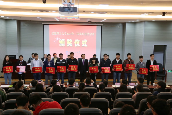 10月26日上午,安徽理工大学2017年“国华科技奖学金”颁奖仪式在校图书馆三楼报告厅隆重举行。副校长孟祥瑞、校党委原书记张明旭出席颁奖仪式。我校杰出校友、北京国华科技集团有限公司董事长赵树彦一行应邀出席并为获奖同学颁奖。颁奖仪式现场(摄影:王涛)孟祥瑞对北京国华科技集团有限公司在校设立奖学金以及长期以来对学校的支持表示感谢,对获奖学生表示祝贺。他希望获奖同学要以感恩之心,再接再厉,以更加优异的成...