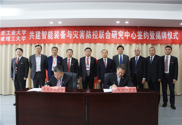 值安徽理工大学和合肥工业大学两校建校75周年华诞之际,10月6日上午,合肥工业大学与安徽理工大学共建智能装备与灾害防控联合研究中心签约暨揭牌仪式在合肥工业大学翡翠湖校区隆重举行。合肥工业大学党委书记余其俊、校长梁樑、党委副书记陈刚、副校长郑磊,我校党委书记郭永存、校长袁亮、党委副书记虞宝桃、副校长郑明东,合肥工大高科信息科技股份有限公司董事长魏臻,合肥恒大江海泵业股份有限公司副总裁王宁等出席仪式。...