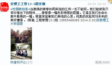 2014年5月12日,由安徽理工大学团委、学生会、大学生社团联合会主办的“纪念五四运动95周年 奋斗的青春最美丽”校园微拍客活动圆满结束。经校内外专家评审,60名大学生微拍客围绕“最美校园风景”、“最美校园人物”、“最美校园故事”和“身边的好青年”四个方面创作的微博、微电影获得了本次活动的一、二、三等奖。一等奖作品截图本次活动是学校获批团中央“学校共青团重点工作创新”试点项目后开展的专题活动之一,...